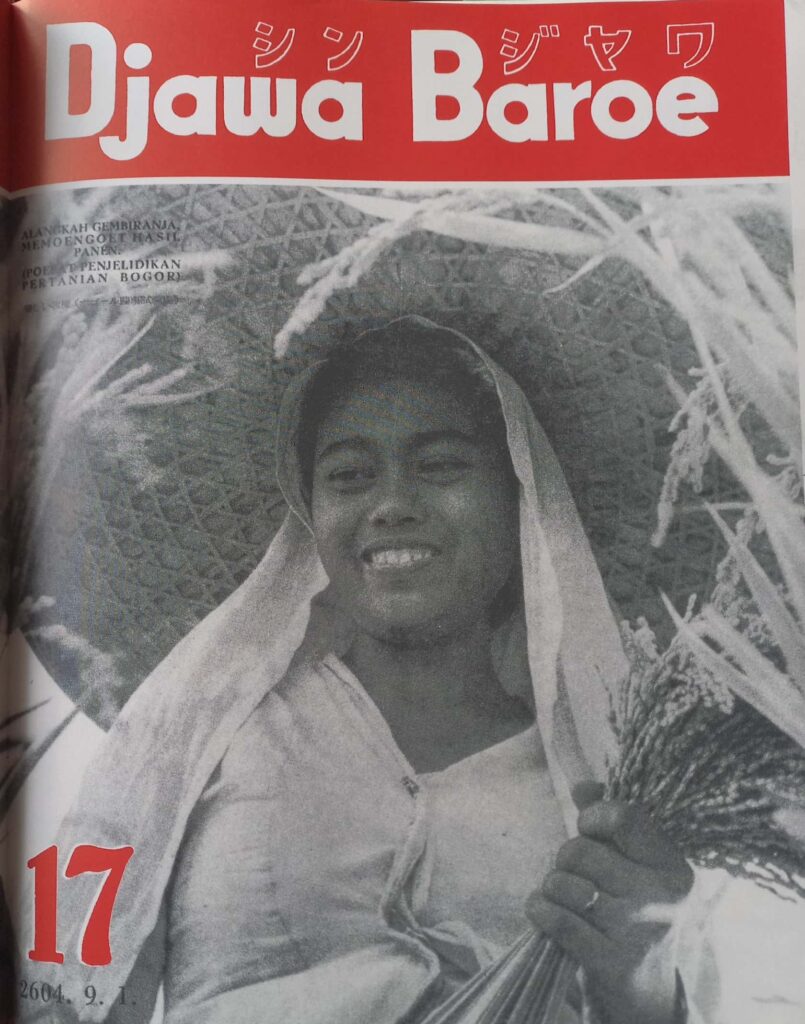 Title in the cover of Djawa Baroe, 17th Edition, year 2604 (1944) showed the importance of agricultural propaganda during the Japanese colonial era through science and technological inventions. This cover portrays a smiling farmer with rice crops.