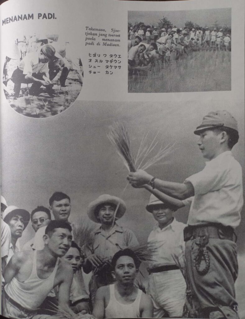 II. Rice planting in Madiun and Bogor led by a Japanese expert. Together with farmers, they implemented new techniques taught by the expert. In this particular archive, it reads “Javanese and Japanese people are helping each other in multiple agricultural harvests”. Source: Djawa Baroe, 18th Edition, year 2603 (1943)