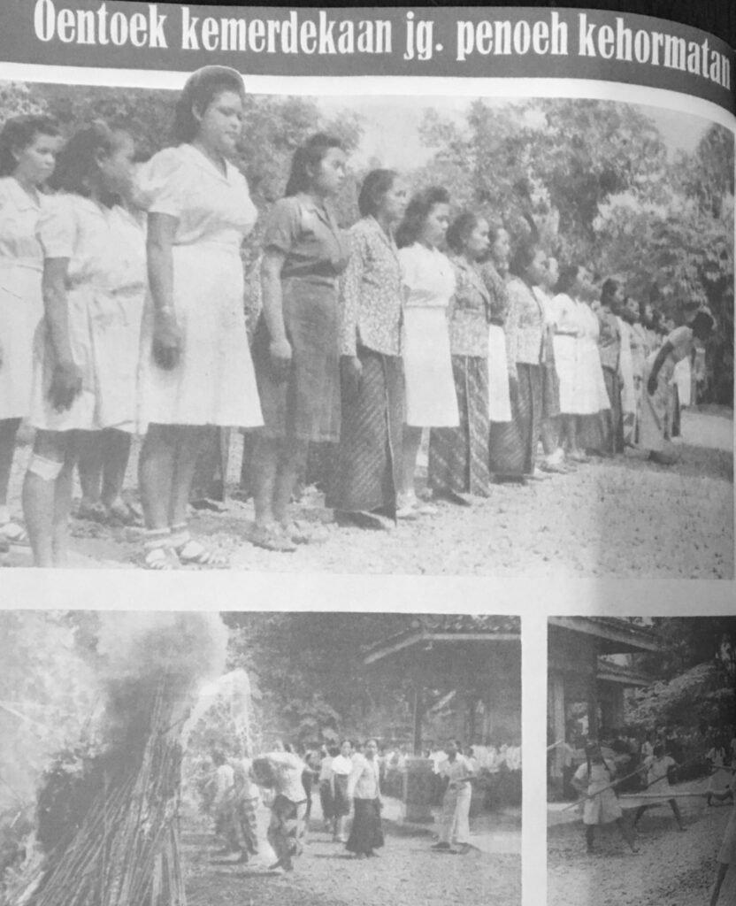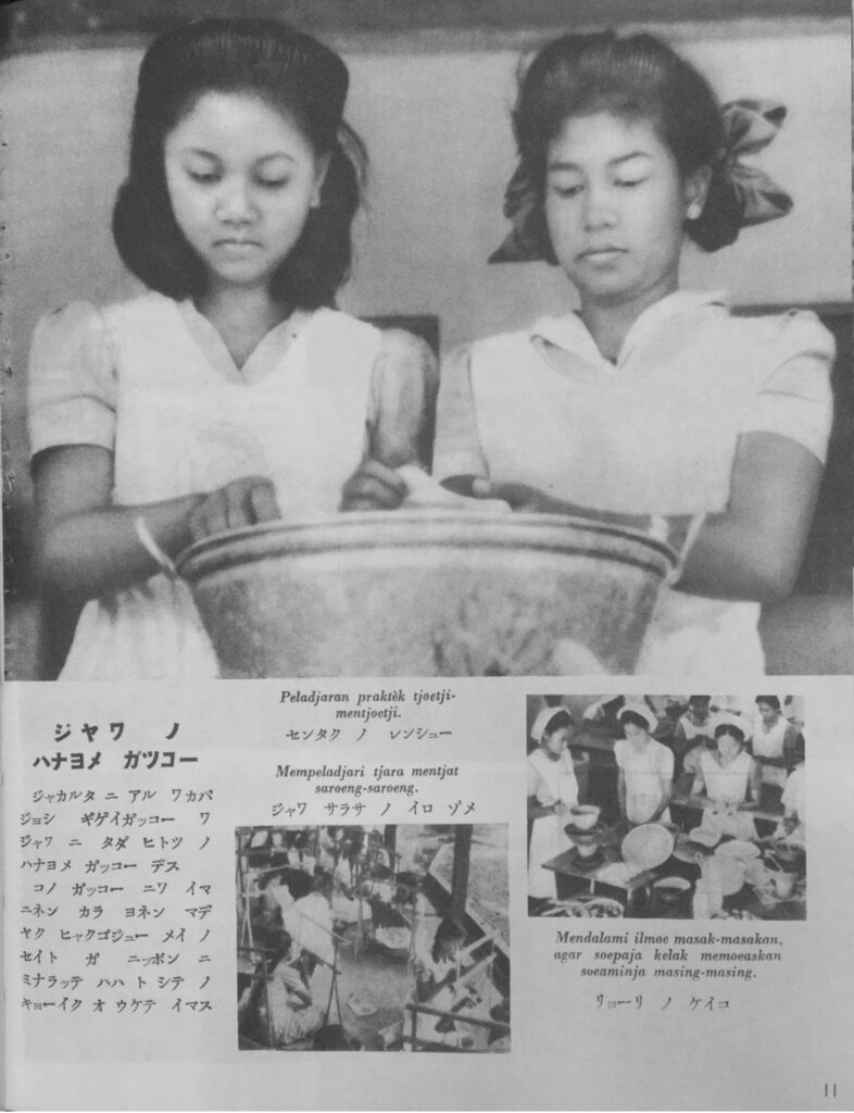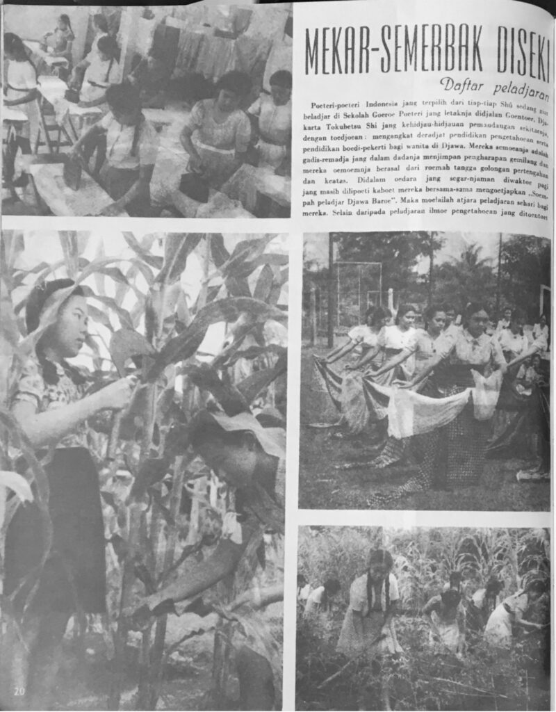 I. In Sekolah Guru Putri (School of Women Teacher), women learn about washing methods, air guard, Javanese dance, and gardening. Source: Djawa Baroe, 3rd Edition, year 2605 (1945).