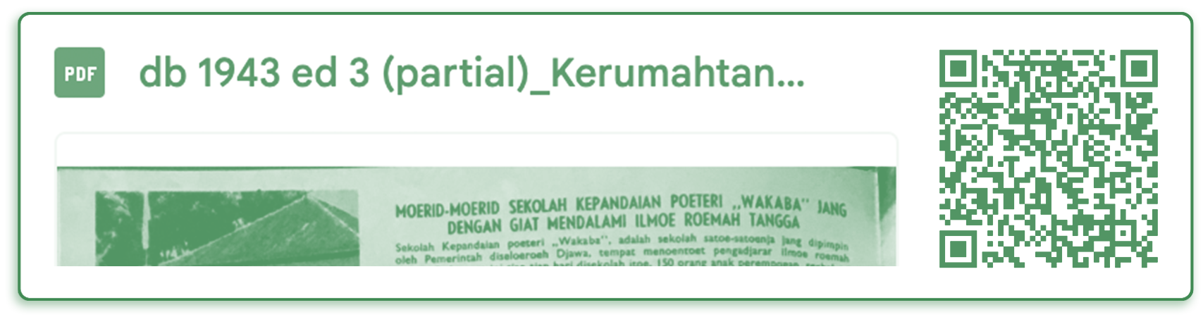 Wakaba was a women’s school managed by the government to learn about home economics such as ikebana, ceremonies, room decoration, homemaking, etc. Source: Djawa Baroe, 3rd Edition, year 2603 (1943).