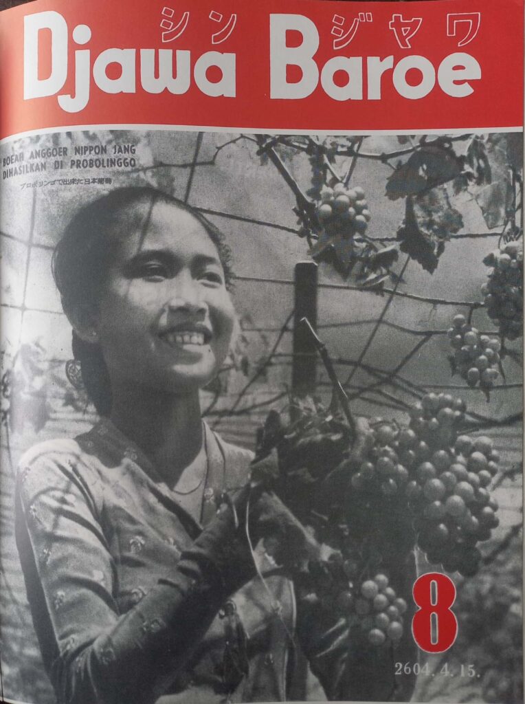 II. プロボリンゴ地域でブドウを摘む女性たちの表紙j。ブドウの植え付けを促すプロパガンダでした。出典:ジャワ・バル第8号2604年(1944年)