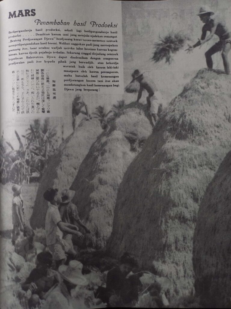 日本は、米の生産を増やし、日本とアジアの共同繁栄を実現するために、労働力を奮起させるためのプロパガンダソングを作成しました。